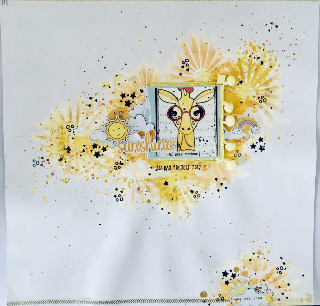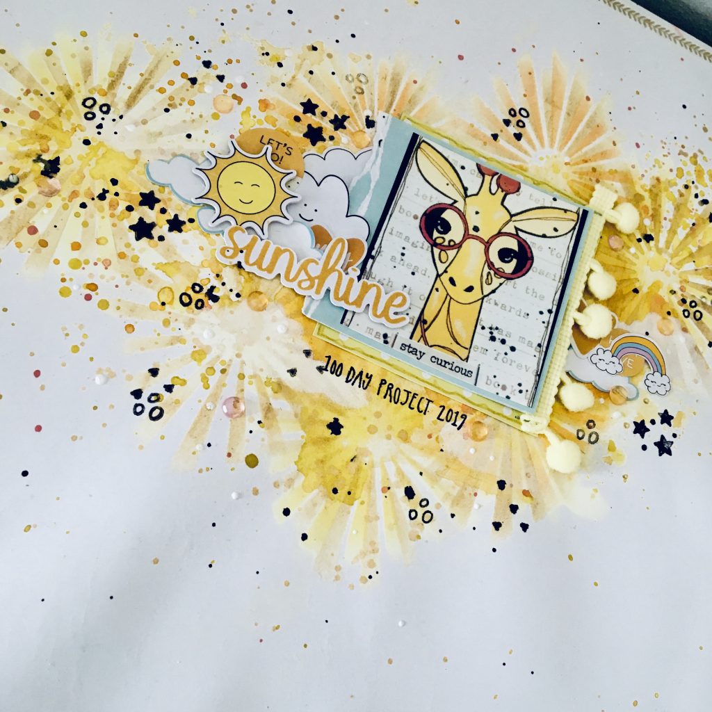 To make this layout, I took a piece of white cardstock and used the Brusho, Distress Oxide and the stencil that came in the kit to create the sunbeams that would make my background. I stenciled the sunbeams, then added splatters and more colour with the Oxides. I then used the clouds stencil that came as an add-on for a previous kit and some white paint to add clouds and also used stamps from previous kits to add some more interest.