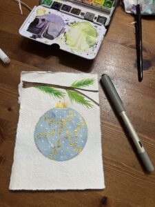 Using brown watercolour paint , I painted a branch at the top. I then drew a string to which the bauble is appearing to hanging from with a black pen later.