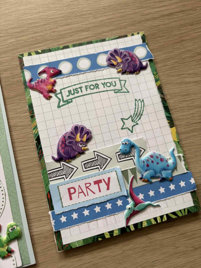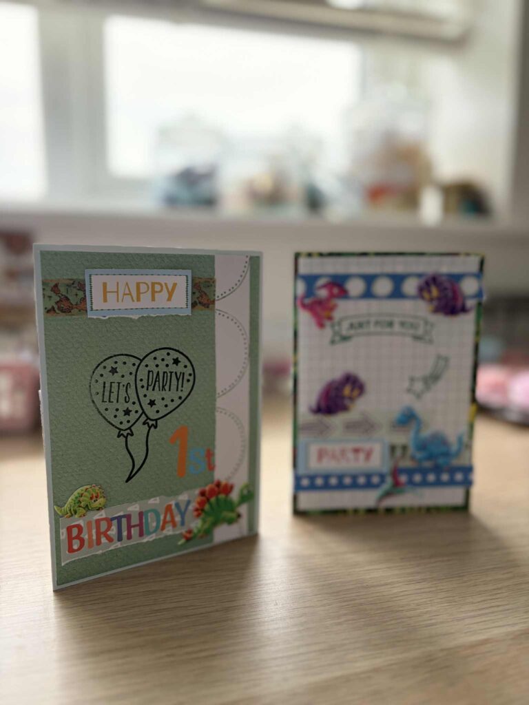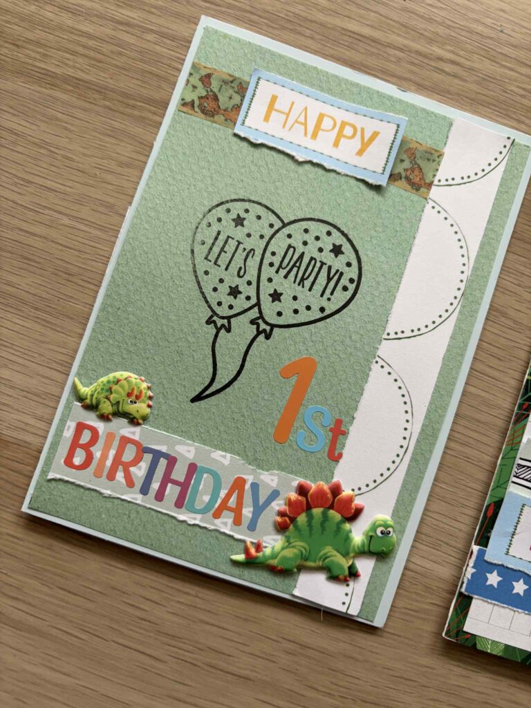 This week I am showing you what to create with your Dino Party kits. This kit is perfect for some DIY crafty cards or invites for children’s birthday parties. I made this well in advance for a friend’s little boy’s first birthday – it isn’t until well into next year, but I like being organised, and this kit was the perfect push to make some dino party cards.