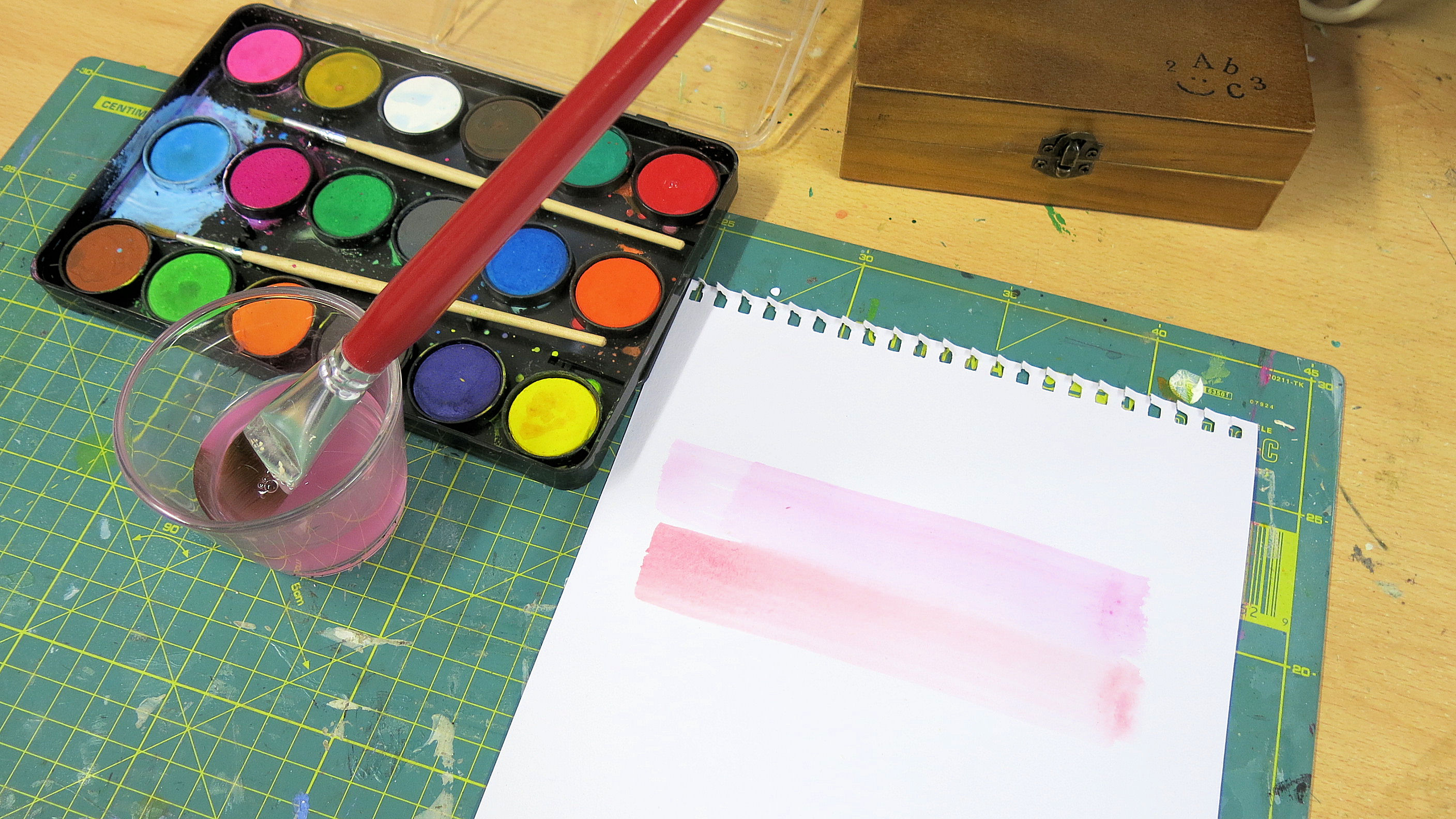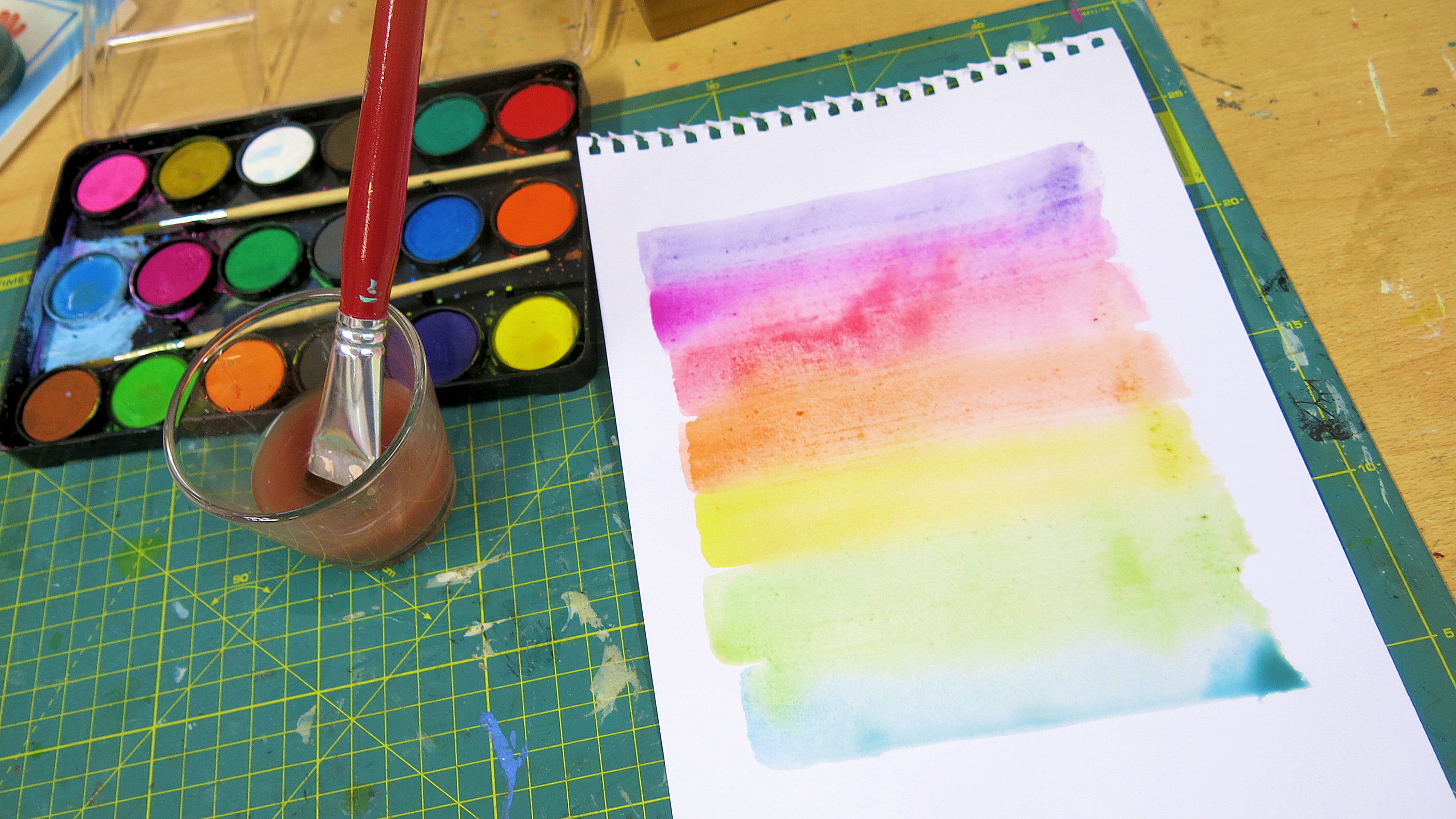1. Start off with your water colour paper. You can use other paper too, but this will work best. I’ve taken a nice wide brush so that I only need to do one stroke at a time. When brushing the paint across your page, keep your brushes in the same direction.
