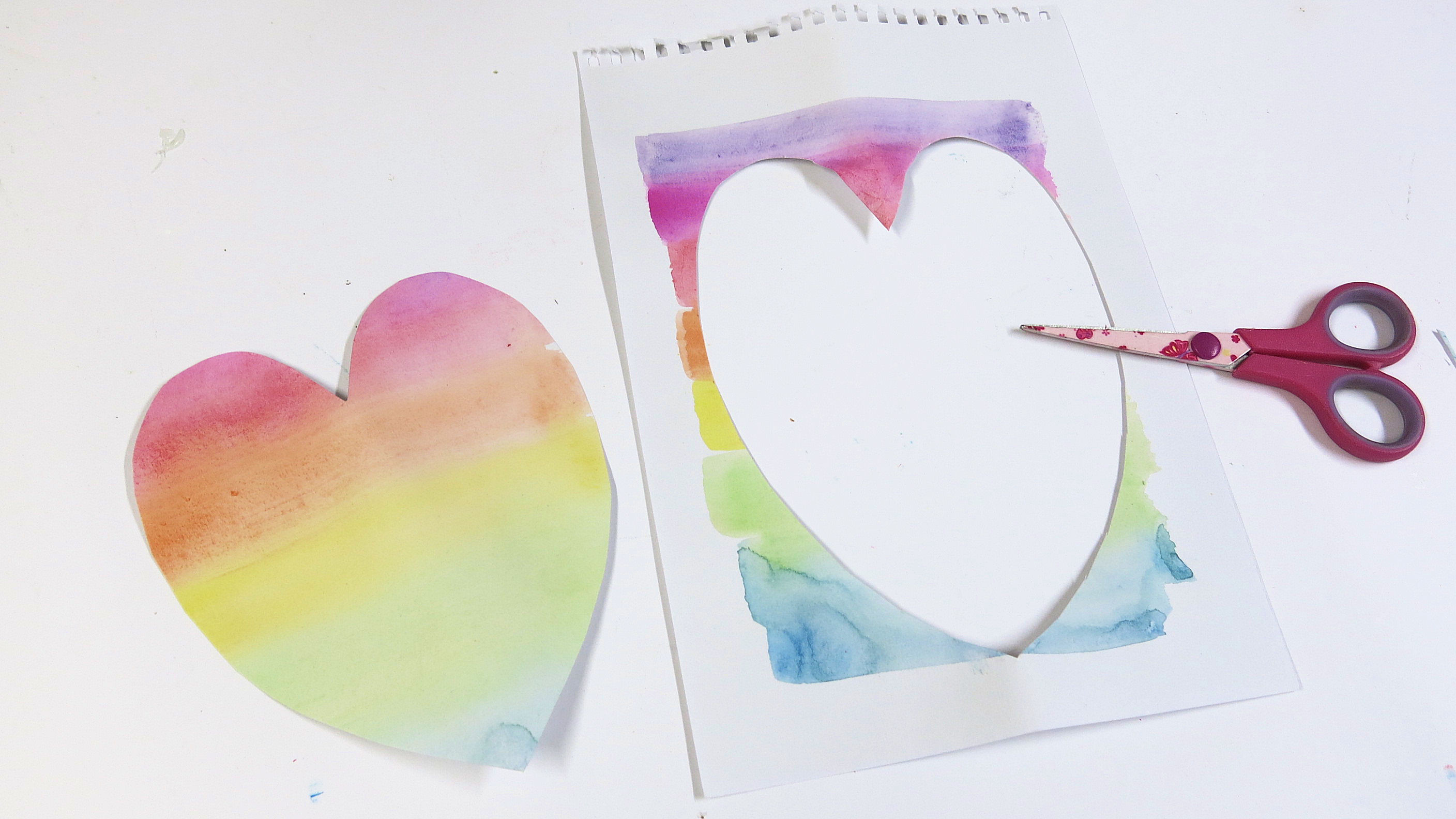 3. Either leave to dry or use a heat gun. Becareful that the paints don’t run when moving the paper. When it’s dry gently fold in half length ways, but not so that you make a crease. Now cut half a heart with the fold being in the centre.
