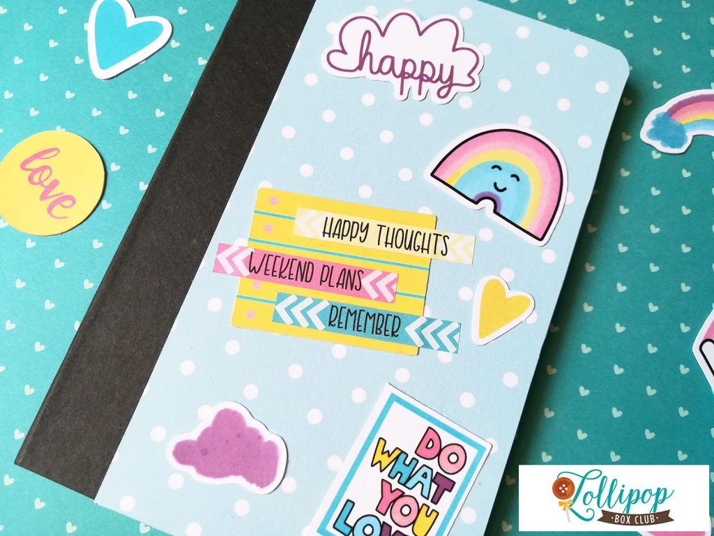 So I grab my January kit and its colorful items and I altered a small notebooks: I covered it with patterned paper and embellished with die-cuts and stickers.