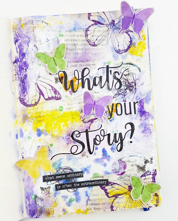 I cut the ‘What’s you Story’ from the info sheet on the top of the box so I didn’t have to cut up the postcard. I like to hoard the postcards!  I added a few stamped butterflies and fussy cut some of the butterfly paper to add on top of the layers.