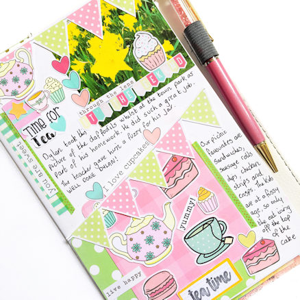 The pink paper was perfect for a picnic blanket, so I added the stickers, and embellishments to it to create a picnic spread. This is what I would like my picnic to look like, but with two fussy kids, who only eat the icing from the top of cakes, it’s usually sausage rolls and crisps.