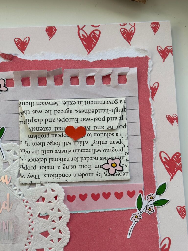 I used the kit papers for the background: the heart print as the base, then tearing up the red piece at the edges to create depth. I added a doily from my own stash, followed by the cut-apart sheet to add more layers and texture. Again this month there are no shortage of stickers and diecuts to use for decoration – just how I like it! I didn’t use any of the valentines/happy mail themed stickers or die cuts on this piece as I was focussing on the self-love / self-care, instead, although I am looking forward to putting those to use elsewhere in my journal soon!