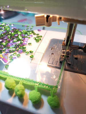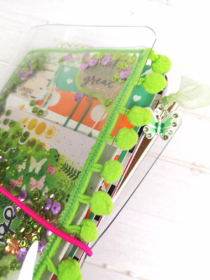 For this months box, I absolutely had to make a shaker dashboard for my clear TN. With my sewing machine all ready, and fingers crossed that she will once and for all behave for me, I cut the acetate to size, stuck on the pompom trim and just went for it!