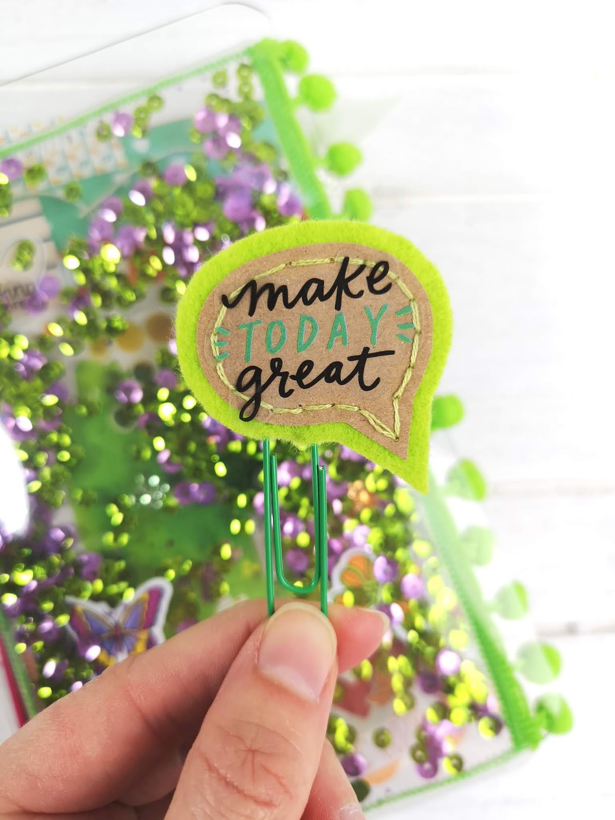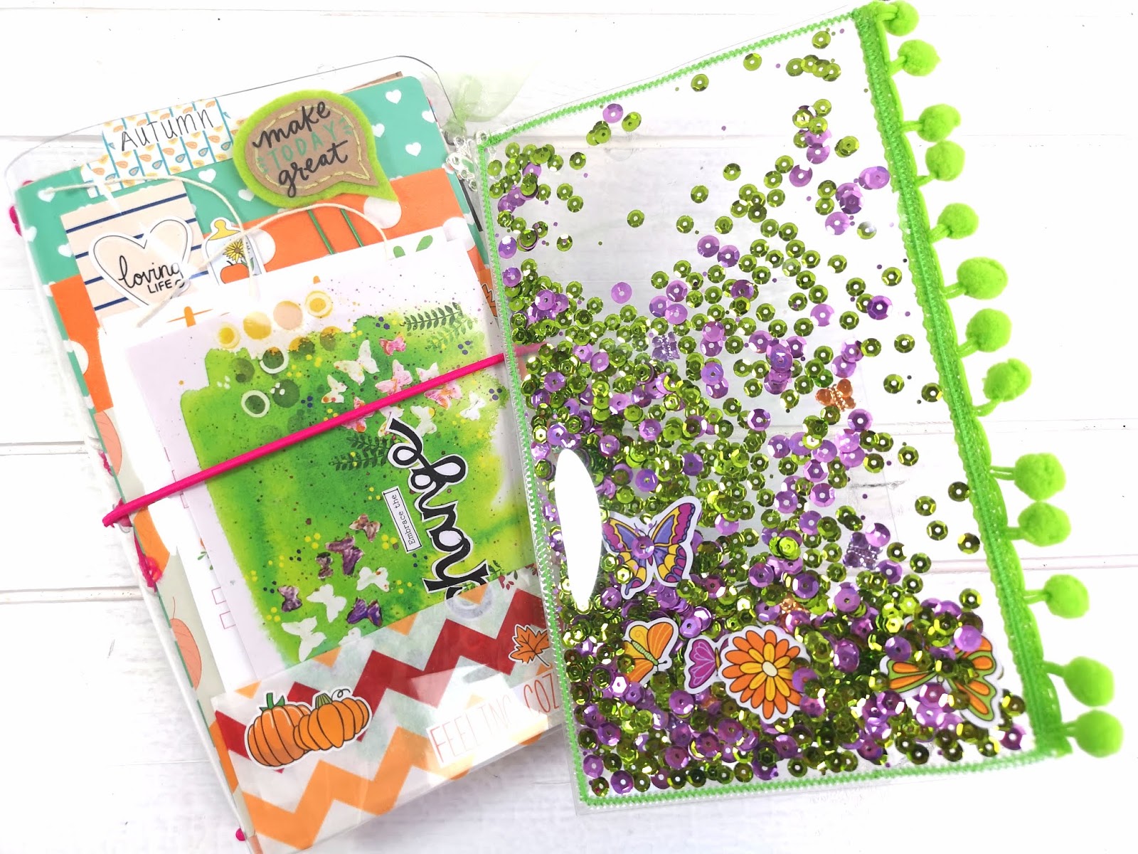 For this months box, I absolutely had to make a shaker dashboard for my clear TN. With my sewing machine all ready, and fingers crossed that she will once and for all behave for me, I cut the acetate to size, stuck on the pompom trim and just went for it!