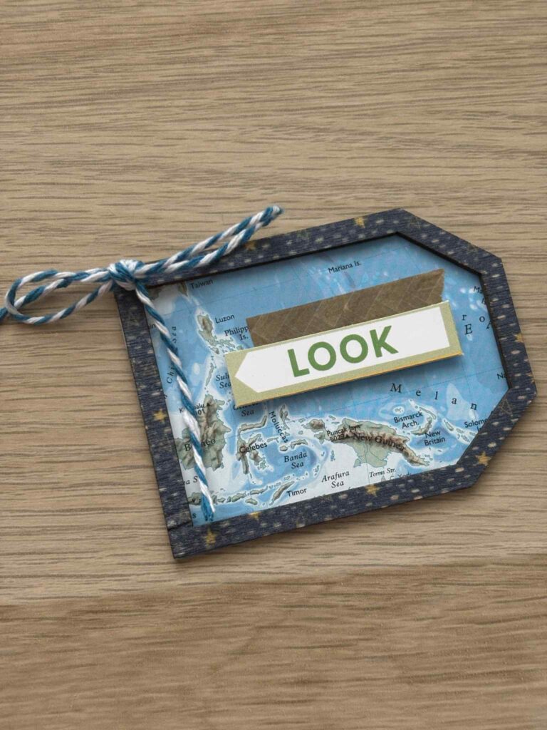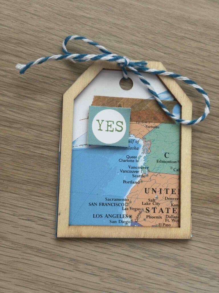 Then, I used a torn piece of washi and the cut apart postcard to add some layers. I didn’t want to add too much as to cover the map page. I then finished it off with adding the twine. Again adding some difference – one I punched a hole through and tied, the other I used my glue gun to secure it in a bow.