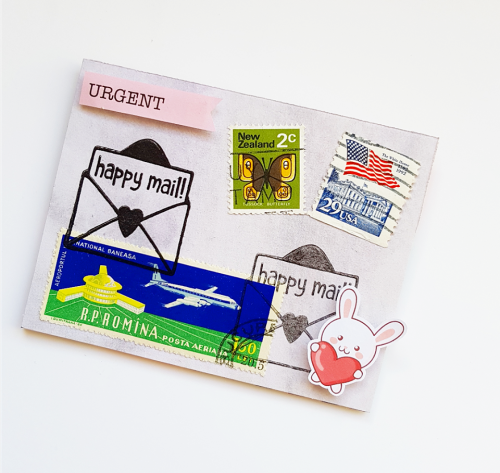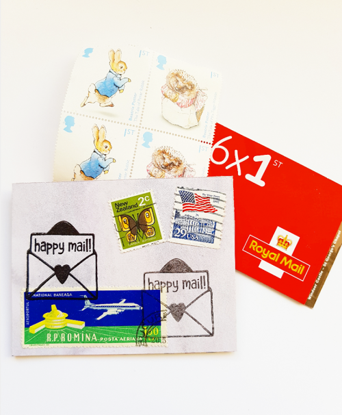 The small brown envelopes I covered with the papers to keep it all the same and decorated with the ‘Happy Mail’ and the world stamps. How cute are those?! I popped some stamps inside for my pen pal to use.